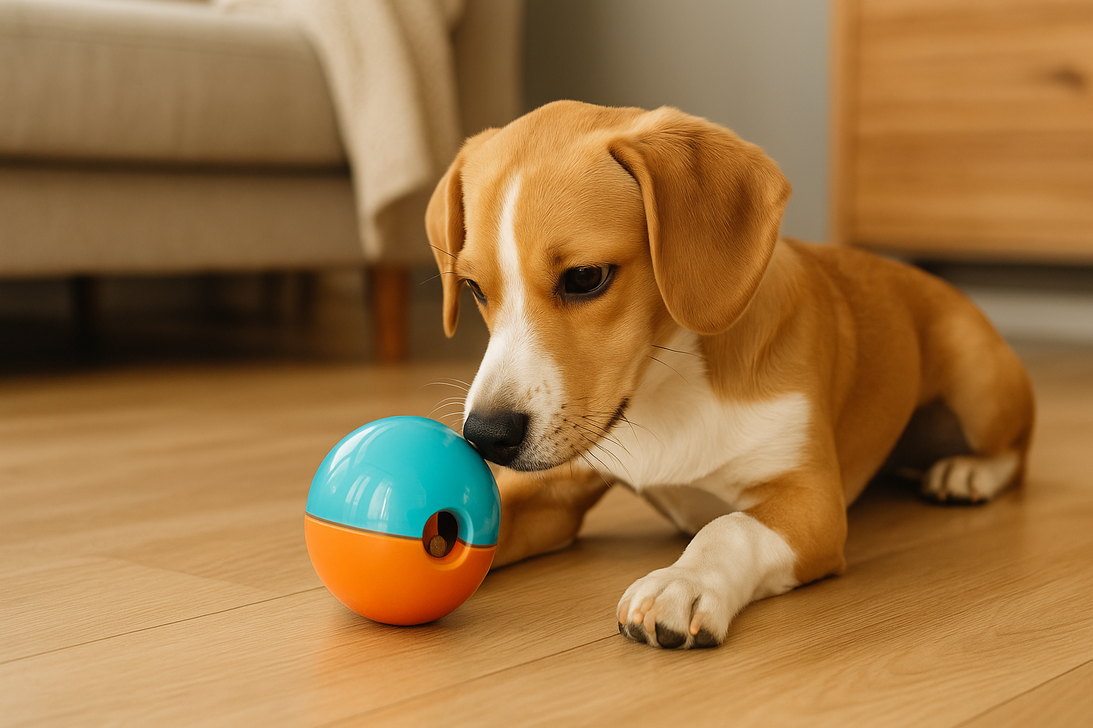 Brinquedos interativos: bolinhas que liberam petiscos, mordedores e quebra-cabeças caninos.